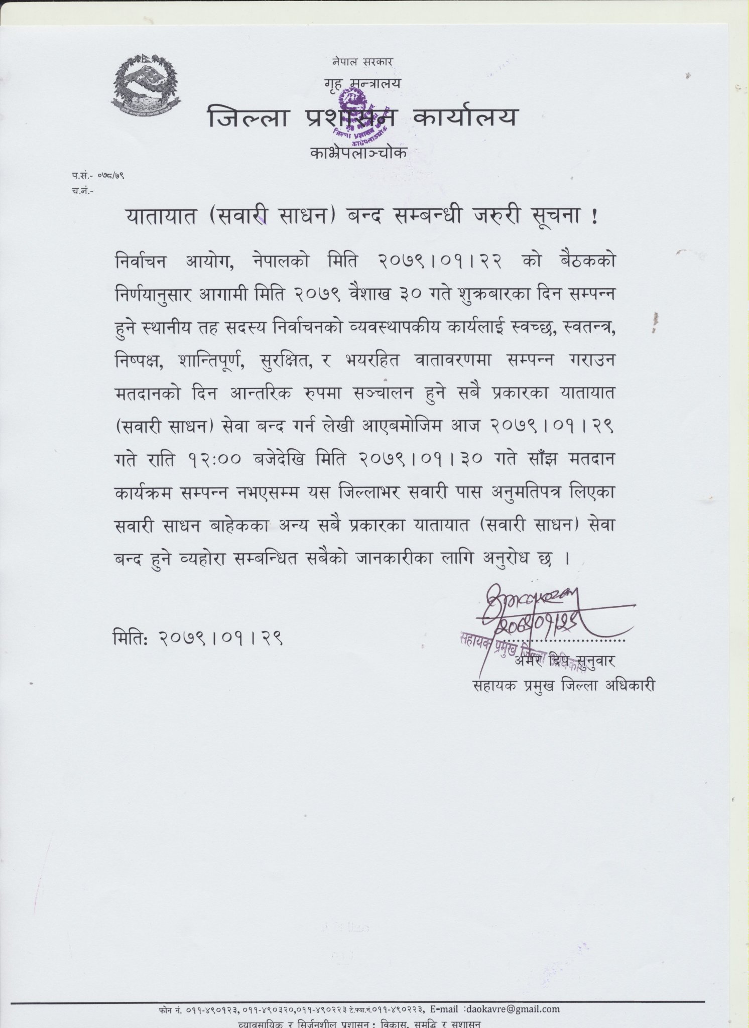 भोली वैशाख ३० गते सम्पन्न हुन गईरहेको स्थानीय तहको निर्वाचन २०७९ लाई ध्यानमा राखी कार्यालयले आज राती १२ बजेदेखि सवारी साधन सञ्चालनमा रोक लगाएको हो । निर्वाचन आयोगको वैशाख २२ गतेको निर्णय अनुसार काभ्रेमा भोली वैशाख ३० गते अति सवारी पास अनुमतिपत्र लिएका सवारी साधन बाहेकका अन्य प्रकारका सबै सवारी साधन बन्द गर्ने निर्णय गरेको कार्यालयबाट प्रकाशित सूचनामा उल्लेख गरिएको छ ।