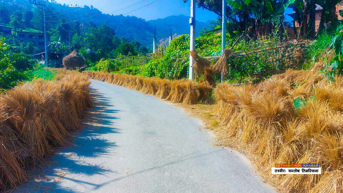 सडक दुवै साइडमा परालको मुठा बाँधेरमा घाममा सुकाइएको दृष्य