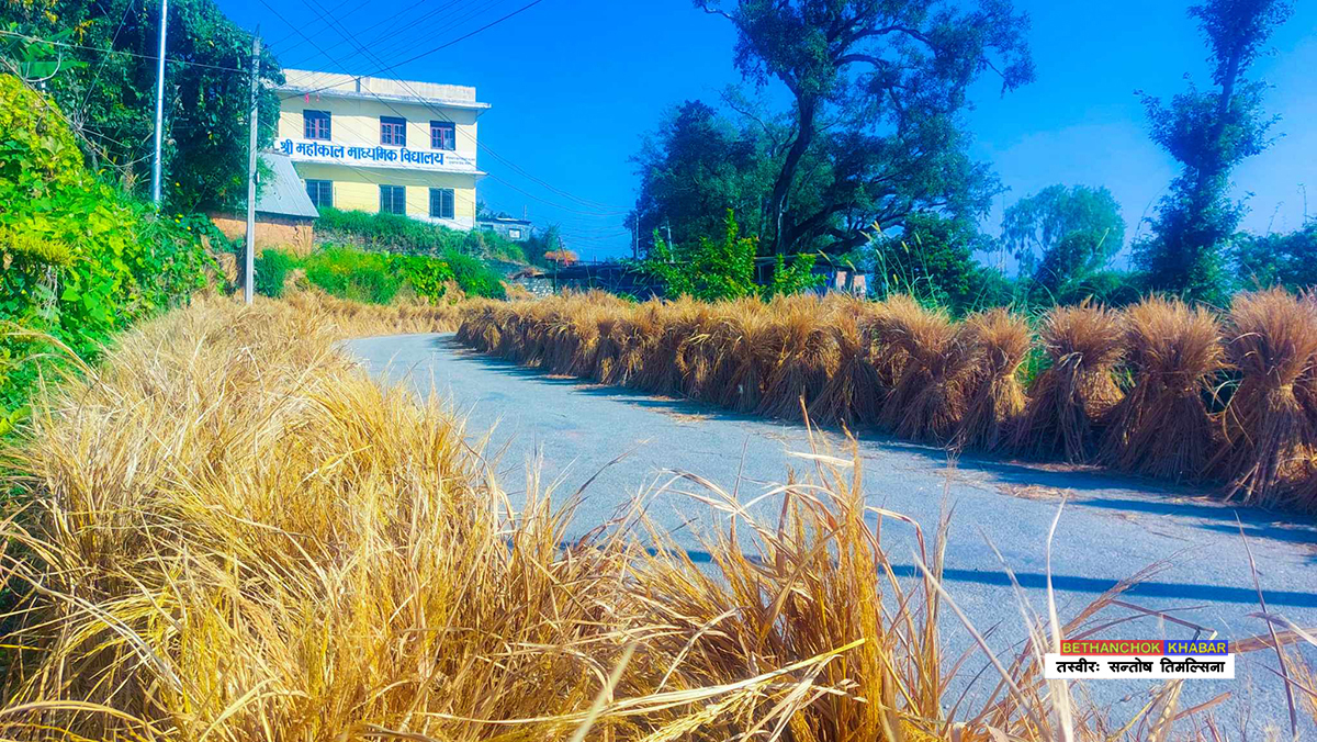 काभ्रे । प्रस्तुत तस्वीर पाँचखाल नगरपालिका वडा नं १० स्थीत बेला सडक दुवै साइडमा परालको मुठा बाँधेरमा घाममा सुकाइएको दृष्य हो ।