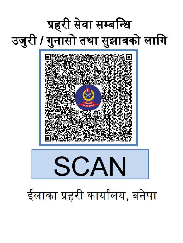 क्युरआर कोड मार्फत अनलाईनमा प्रहरी कर्मचारीहरु विरुद्ध उजुरी, कुनै गुनासो वा प्रहरी काम कारवाहीको बारेमा जानकारी गराउने उद्देश्यले क्युआर व्यवस्था ल्याइएको ईलाका प्रहरी कार्यालय बनेपाका प्रमुख लालध्वज सुबेदीले जानकारी दिए ।