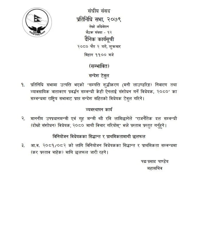 संसद् भवन नयाँ बानेश्वरमा आज बिहान ११ बजे प्रतिनिधि सभा बैठक बस्नेछ भने राष्ट्रियसभा बैठक बिहान ११ बजेर १५ मिनेटमा बस्नेछ ।