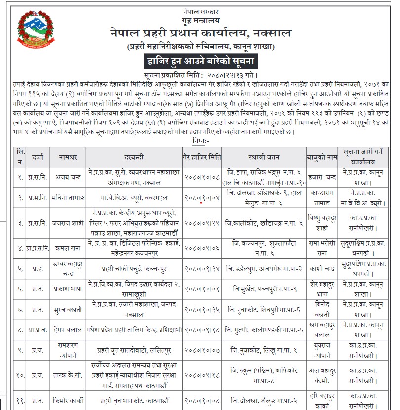सूचनामा उनीहरूलाई सात दिनभित्र चित्तबुझ्दो स्पष्टीकरणसहित कार्यालयमा हाजिर हुन आउन भनेको छ। अन्यथा प्रहरी नियमावलीअनुसार सेवाबाट हटाइने जानकारी कार्यालयले गराएको छ।