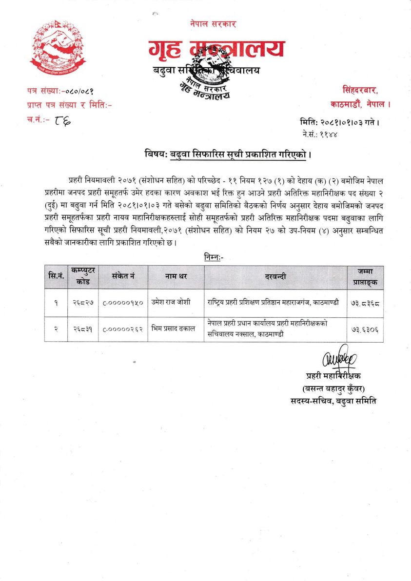 गृह-सचिव एकनारायण अर्यालकाे अध्यक्षतामा प्रधानमन्त्री तथा मन्त्रिपरिषद्को कार्यालयका सचिव र प्रहरी महानिरीक्षक (आईजीपी) सदस्य सचिव रहेको समितिले उमेश राज जोशी र भीमप्रसाद ढकाललाई बढुवा गर्न सिफारिस गरेको हो । जोशी राष्ट्रिय प्रहरी प्रशिक्षण प्रतिष्ठान महाराजगन्ज र प्रवक्तासमेत रहेका ढकाल नेपाल प्रहरी प्रधान कार्यालयको आईजीपी सचिवालयमा कार्यरत छन् ।