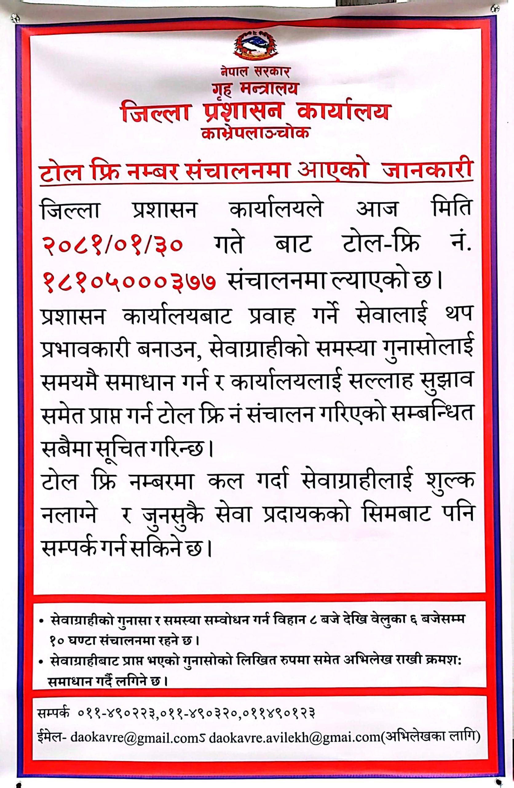 काभ्रे । जिल्ला प्रशासन कार्यालय काभ्रेपलाञ्चोकमा आज (आईतबार) देखि निःशुल्क टोल फ्रि नंवर सेवा सुरु गरिएको छ । कार्यालयबाट प्रवाह हुने सेवालाई थप प्रभावकारी बनाउन उक्त सेवा सुरु गरिएको जनाइएको छ ।