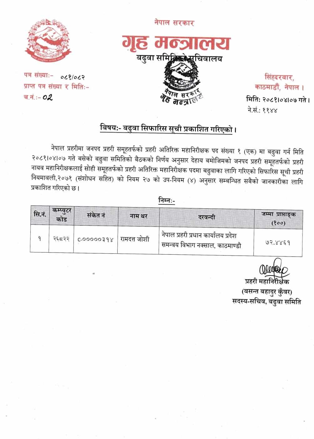 काठमाडौँ । नेपाल प्रहरीका प्रहरी नायब महानिरीक्षक (डीआईजी) रामदत्त जोशी प्रहरी अतिरिक्त महानिरीक्षक (एआईजी)मा बढुवाका लागि सिफारिस भएका छन् ।
