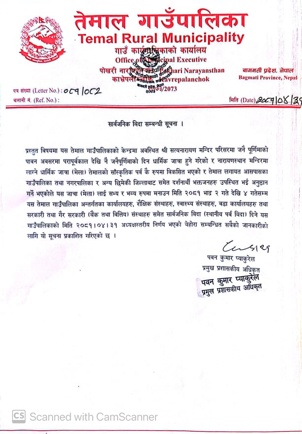 काभ्रे । जिल्लाकाे तेमाल गाउँपालिकाले जनैपूर्णिमाका उपलक्ष्यमा ३ दिन सार्वजनिक विदाको घोषणा गरेको छ । गाउँपालिकाकाे प्रमुख प्रशासकीय अधिकृत पवनकुमार प्याकुरेलले एक सूजना जारी गर्दै ३ दिन सार्वजनिक विदाकाे घोषणाा गरेकाे हाे ।