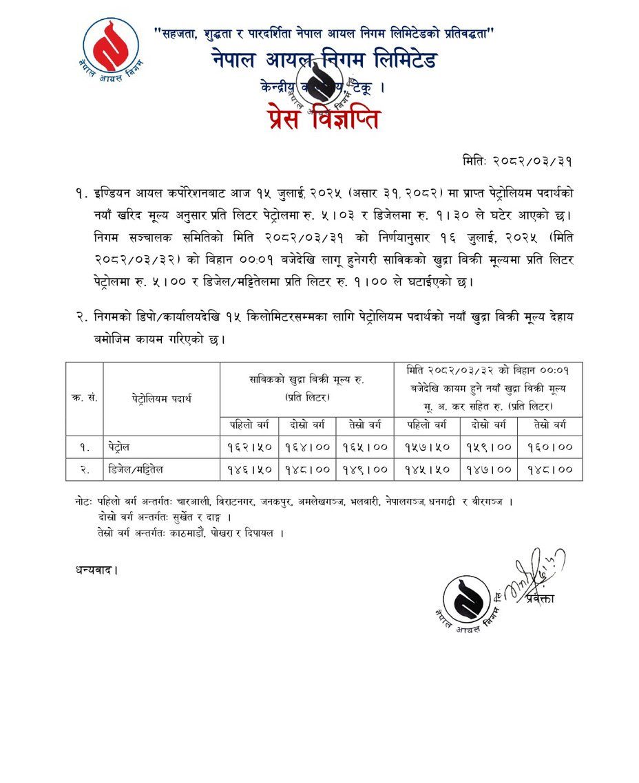 काभ्रे । पेट्रोलियम पदार्थको मूल्य घटेको छ । नेपाल आयल निगमका अनुसार पेट्रोल ५ रुपैँयाले घटेको हो भने डिजेल १ रुपैयाँले घटेको हाे । बुधबारदेखि लागू हुनेगरी पेट्राेलियम पदार्थकाे मूल्य घटाइएकाे निगमले जनाएकाे छ ।