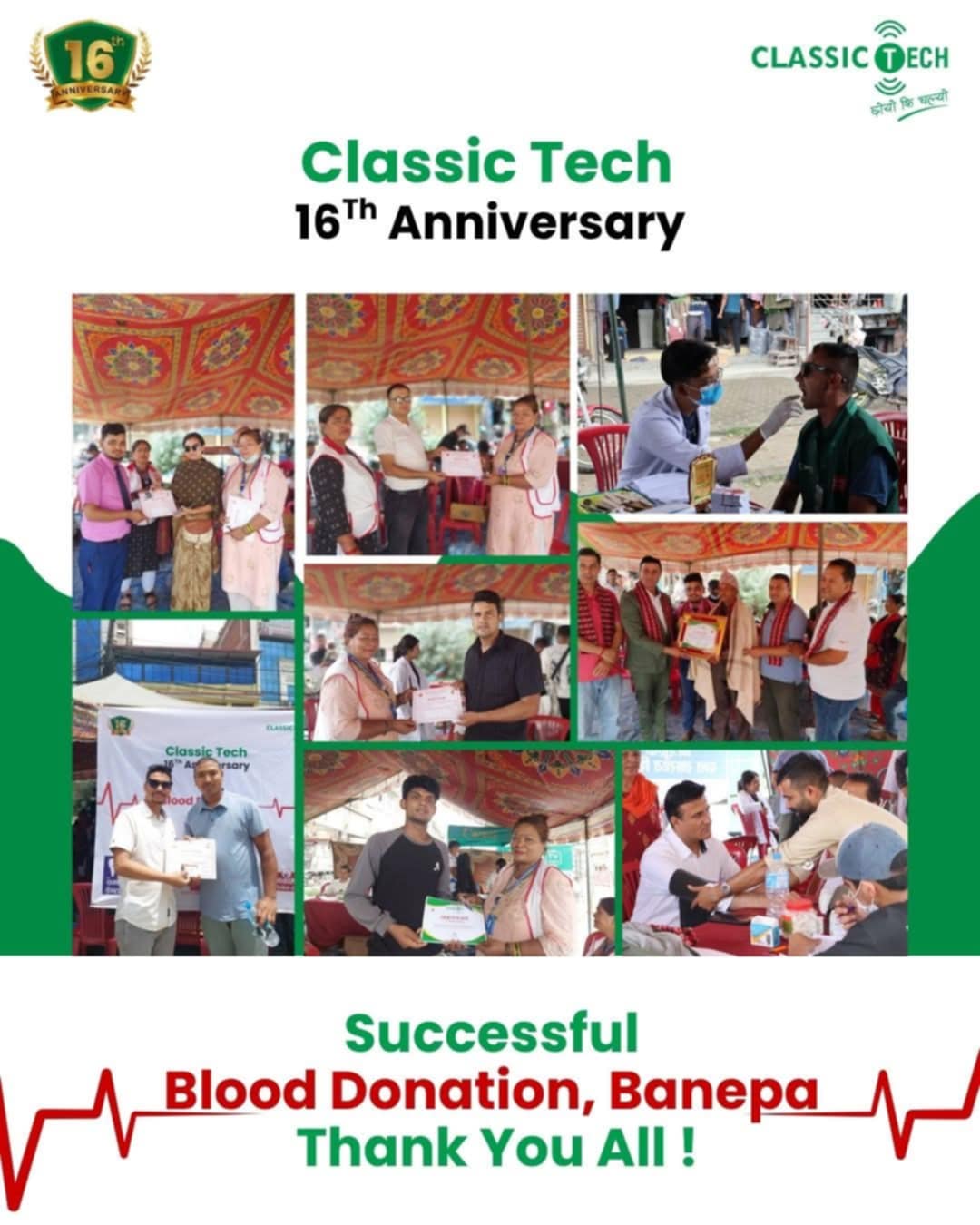 काभ्रे । देशकै अग्रणी तथा ठुलो इन्टरनेट सेवा प्रदायक कम्पनि क्लासिक टेकले १६ औं वार्षिकोत्सवको अवसरमा बनेपा स्थित चारदोबाटोमा रक्तदान कार्यक्रम सम्पन्न गरेको छ।