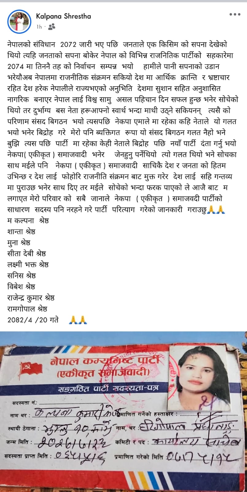 काभ्रे । नेकपा एस काभ्रेकी नेतृ कल्पना श्रेष्ठले परिवारसहित पार्टी छाडेकी छन् । फेसबुकमा स्टाटस लेख्दै उनले पार्टी सोचेको भन्दा फरक पाएकोले आजैबाट आफूसहित परिवारका अन्य सदस्यले पार्टी परित्याग गरेको उल्लेख गरेकी छन् ।