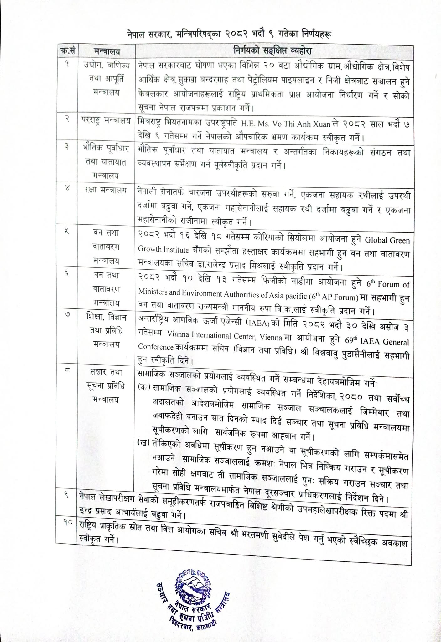 बुधबार सरकारका प्रवक्ता समेत रहेका सञ्चार तथा सुचना प्रविधिमन्त्री पृथ्वीसुब्बा गुरुङले मन्त्रिपरिषद् बैठकका विभिन्न १० वटा निर्णयहरू सार्वजनिक गरेका हुन् ।