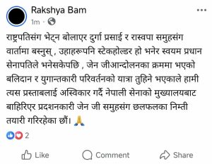 उनले लेखेकी छन् । , ” राष्ट्रपतिसंग भेट्न बोलाएर दुर्गा प्रसाई र रास्वपा समुहसंग वार्तामा बस्नुस् , उहाहरूपनि स्टेकहोल्डर हो भनेर स्वयम प्रधान सेनापतिले भनेसकेपछि , जेन जीआन्दोलनका क्रममा भएको बलिदान र युगान्तकारी परिवर्तनको यात्रा तुहिने भएकाले हामी त्यस प्रस्ताबलाई अस्विकार गर्दै नेपाली सेनाको मुख्यालयबाट बाहिरिएर प्रदशनकारी जेन जी समुहसंग छलफलका निम्ती तयारी गरिरहेका छौं।”