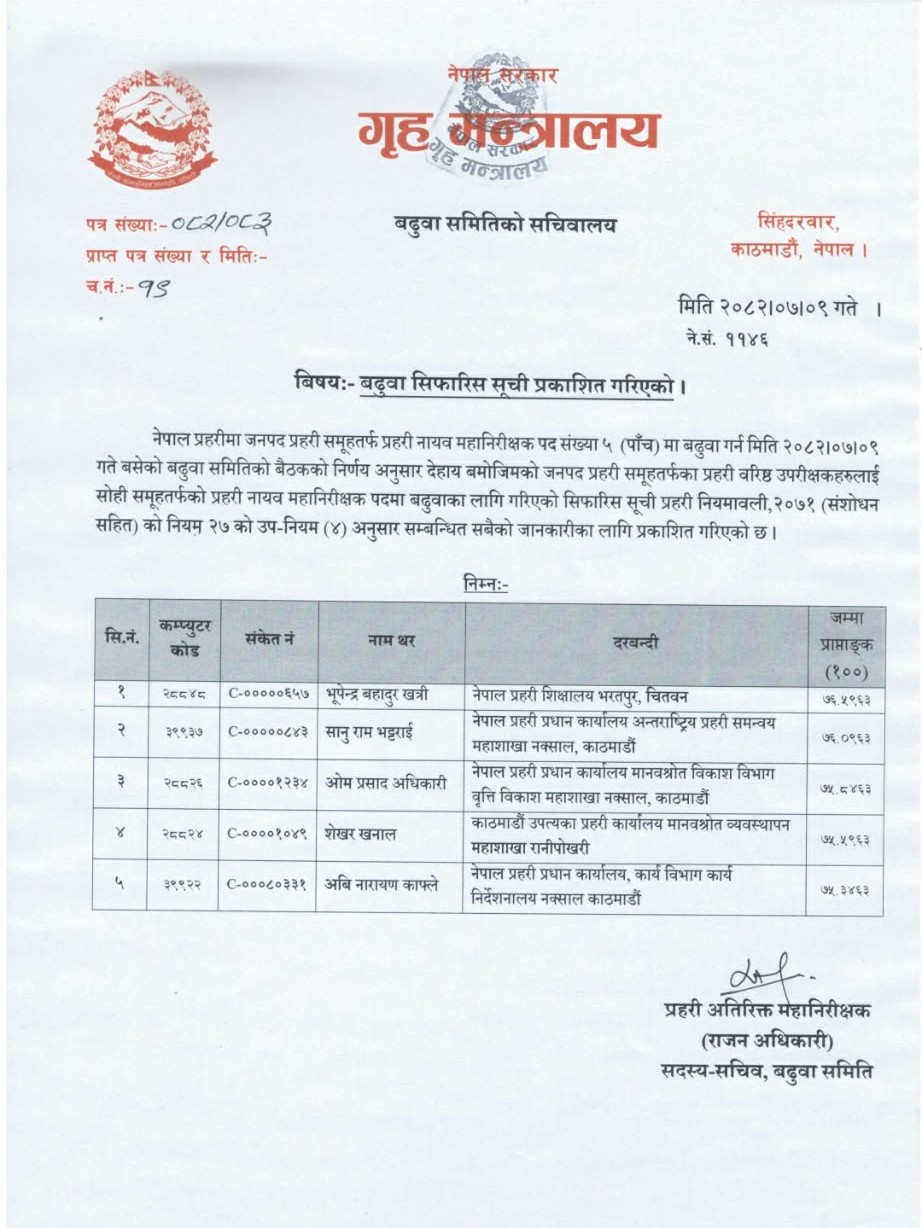 समितिले एसएसपी भूपेन्द्रबहादुर खत्री, सानुराम भट्टराई, ओम अधिकारी, शेखर खनाल र अविनारायण काफ्लेको बढुवा सिफारिस गरेको हो ।