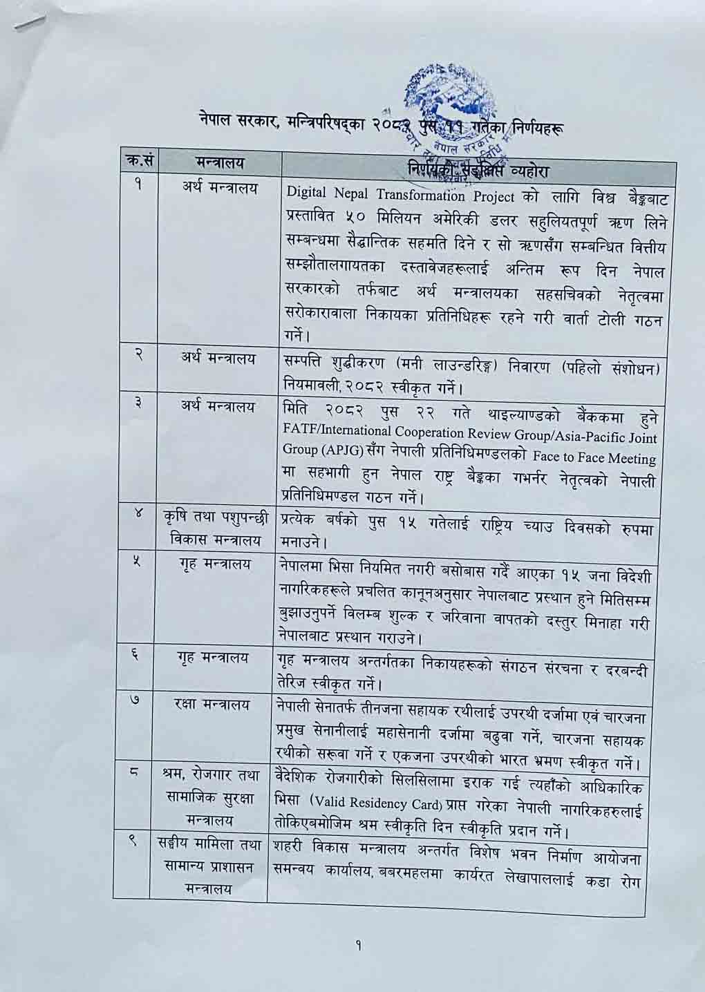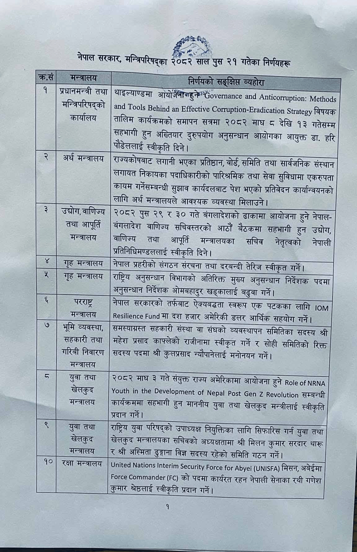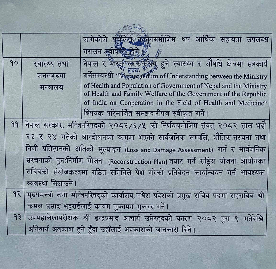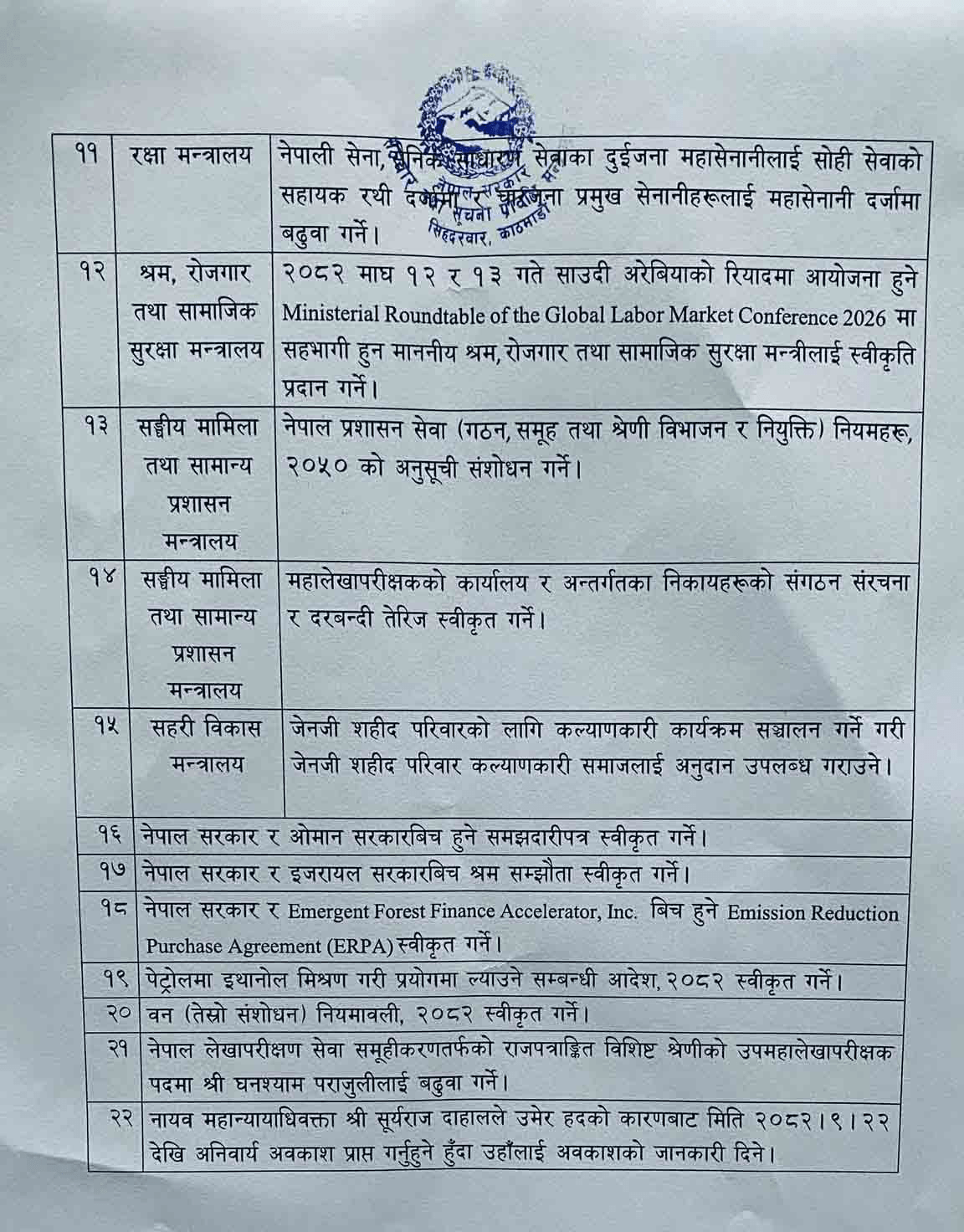 काठमाडौं । सरकारले आज मन्त्रिपरिषद् बैठकका निर्णय सार्वजनिक गरेको छ।