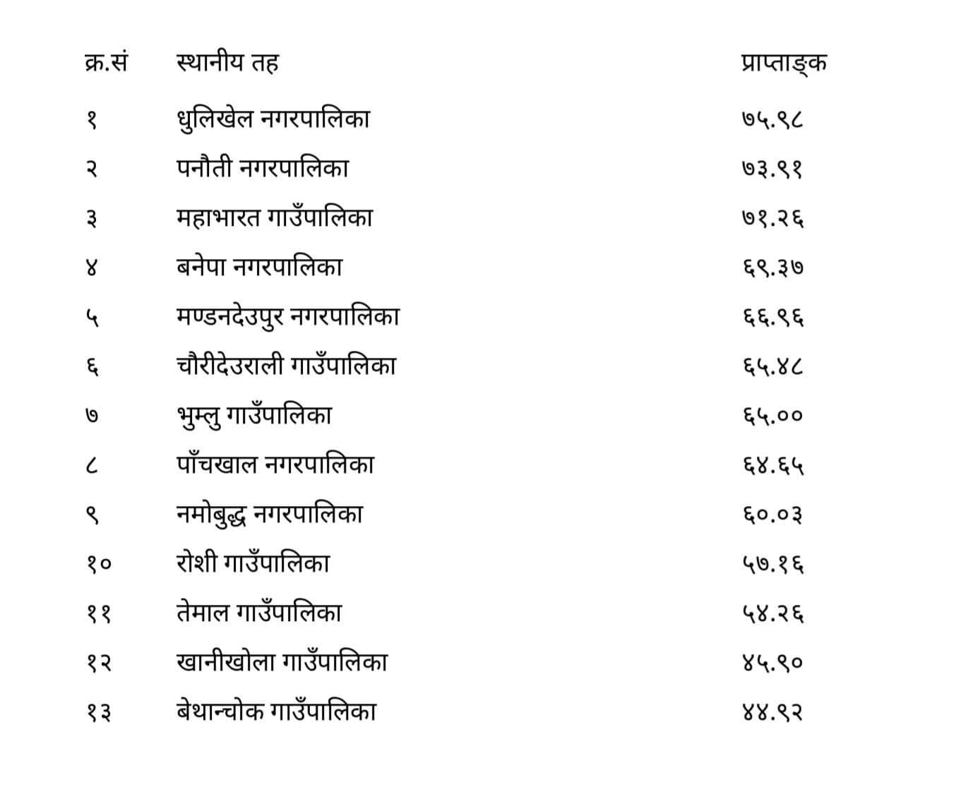 बनेपा नगरपालिका ६९.३७ अंकसहित चौथो र मण्डनदेउपुर नगरपालिका ६६.९६ अंकसहित पाँचौं स्थानमा परेका छन्। त्यसैगरी चौरीदेउराली गाउँपालिका ६५.४८ अंकसहित छैटौं, भुम्लु गाउँपालिका ६५.०० अंकसहित सातौं र पाँचखाल नगरपालिका ६४.६५ अंकसहित आठौं स्थानमा रहेका छन्।
